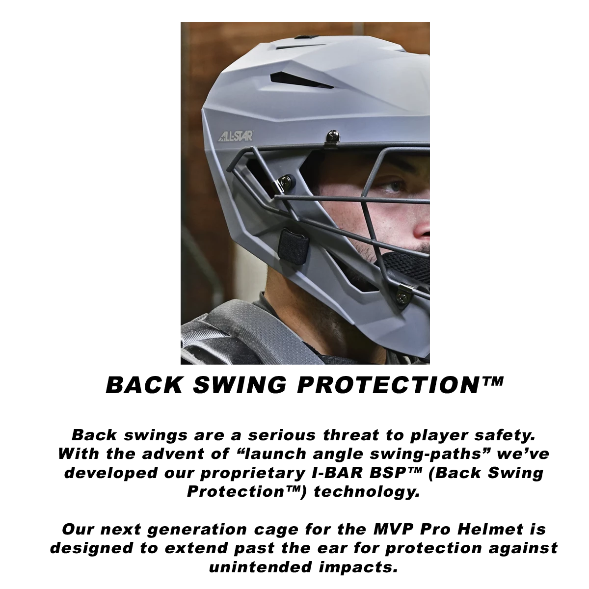 - Back swings are a serious threat to player safety. With the advent of “launch angle swing-paths” we’ve developed our proprietary I-BAR BSP™ (Back Swing Protection™) technology. Our next generation cage for the MVP Pro Helmet is designed to extend past the ear for protection against unintended impacts.