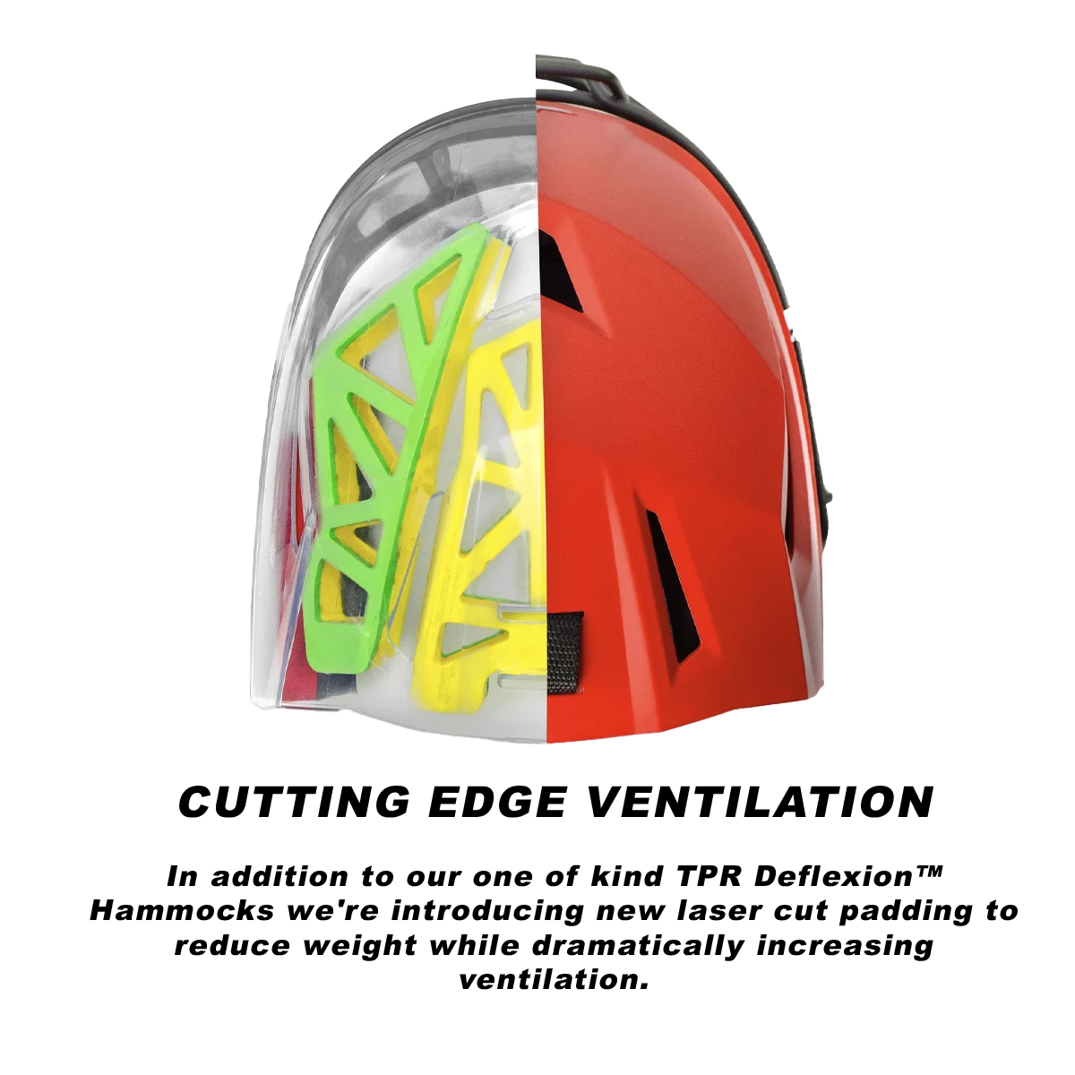- CUTTING EDGE VENTILATION- In addition to our one of kind TPR Deflexion™ Hammocks we’re introducing new laser cut padding to reduce weight while dramatically increasing ventilation.